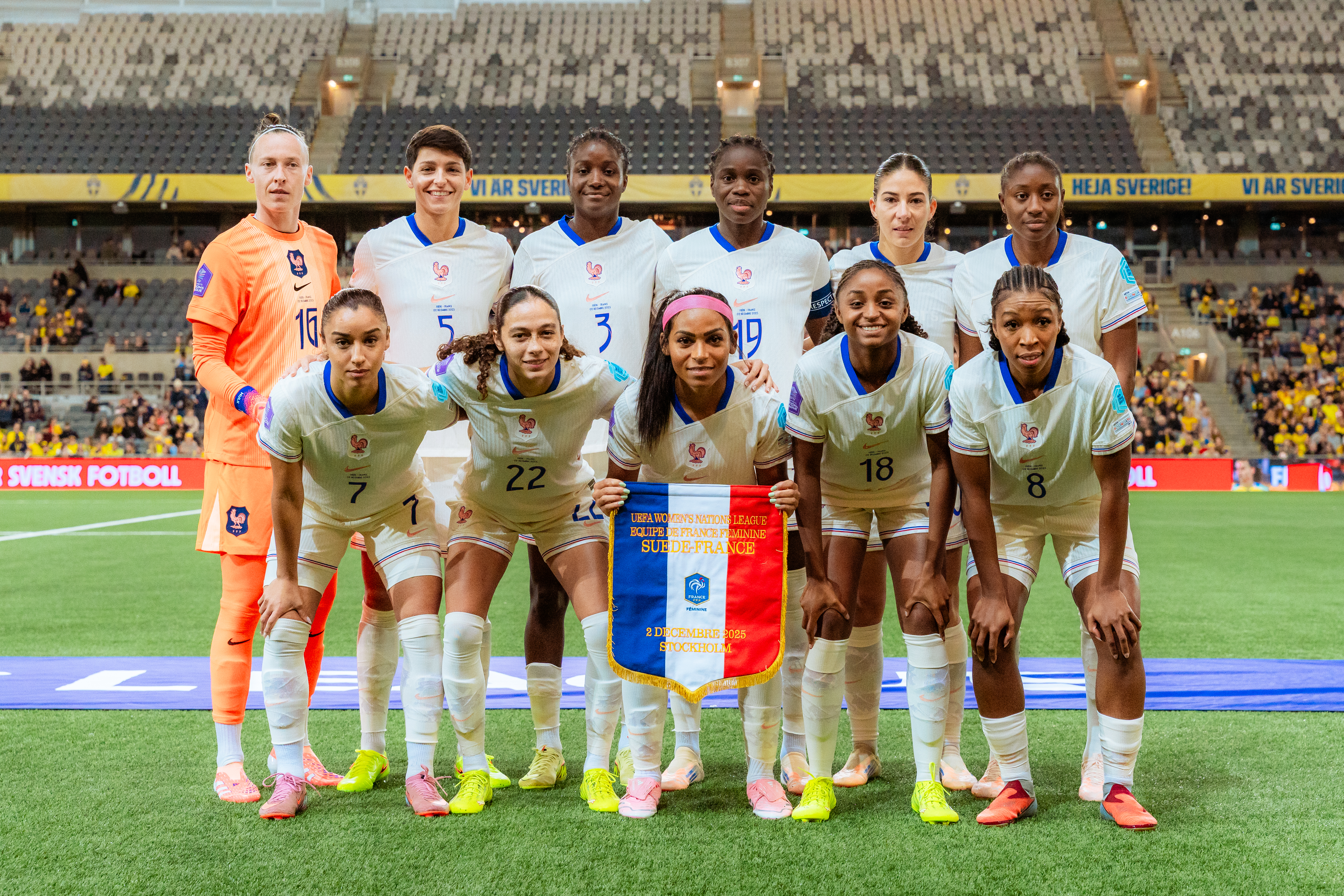 Après une victoire arrachée (2-1) sur le fil à l’aller vendredi, l’équipe de France féminine a terminé à la 3e place de la Ligue des Nations 2025 avec un nul en Suède (2-2 a.p.) ce mardi lors de la manche retour. Dans une rencontre disputée, les Bleues ont ouvert le score grâce à Mateo (58e). Mais dans les derniers instants du temps réglementaire, Ijeh (84e) puis Kafaji (90+2e) ont égalisé pour les Suédoises sur l’ensemble des deux matchs ! Finalement, lors de la prolongation, les joueuses de Laurent Bonadei ont fait la différence grâce à Gago (106e).