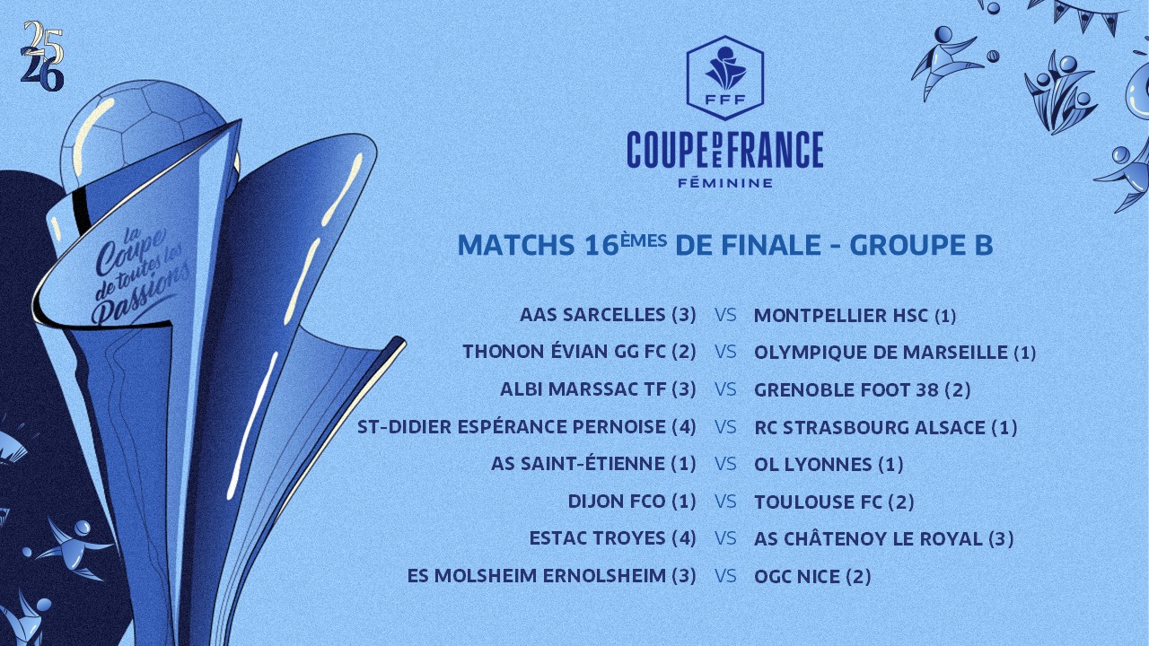 Deux chocs entre clubs de l’élite sont au menu pour les 16es de finale de la Coupe de France Féminine : celui entre le RC Lens et le Paris FC, tenant du titre, et le derby entre l’AS Saint-Etienne et l’OL Lyonnes. Le PSG accueillera Lille (D2).